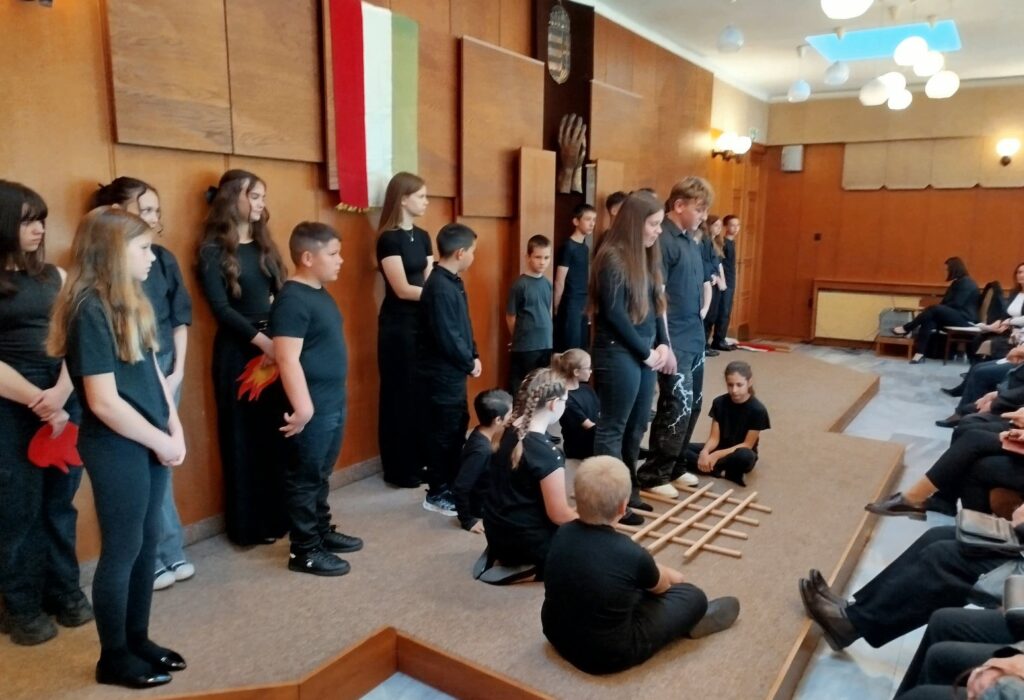 A Városháza dísztermében megtartott ünnepi megemlékezés folytatásában a II. Rákóczi Ferenc NNNY Általános Iskola tanulói magával ragadó zenés irodalmi műsorral idézték fel a 69 évvel ezelőtti megrázó, ugyanakkor hősies és lélekemelő eseményeit. A megemlékezés a berhidai Hősök terén koszorúzással zárult. Az ’56-os emlékműnél elsőként a városvezetés nevében Pergő Margit polgármester és Nyírő István alpolgármester hajtott fejet az ’56-os forradalom és szabadságharc hősei előtt, majd településünk intézményei, civil szervezetei és közösségei helyezték el koszorúikat az emlékműnél.