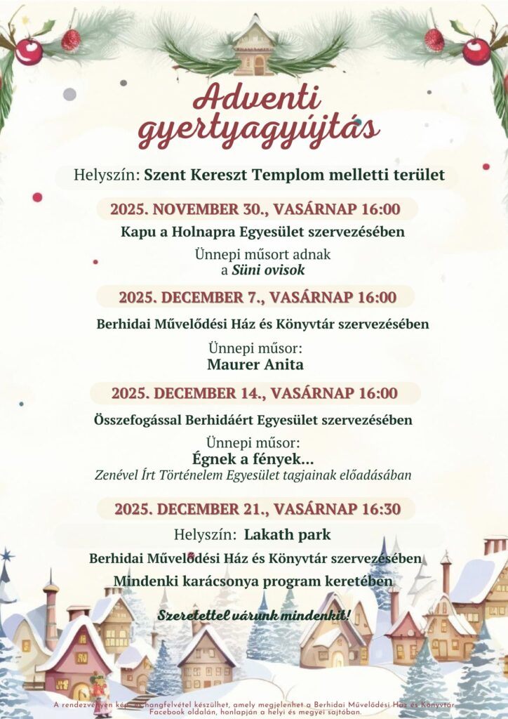 A decemberi rendezvények folytatódnak, hiszen az egész adventi ünnepkörben, a Berhidai Művelődési Ház és Könyvtárral összefogva szeretettel várnak mindenkit a közös adventi gyertyagyújtásokra, amelyek lehetőséget adnak a találkozásra és a várakozás közös megélésére városunkabn, a legnagyobb helyi értékünk, a Szent Kereszt templom terén! December 21-én pedig, a Karácsonyi Csillag autós fényfelvonulás után a Lakath Parkban találkozhatnak majd a berhidai ünnepelők.
