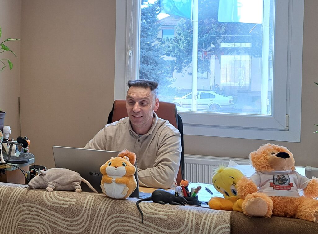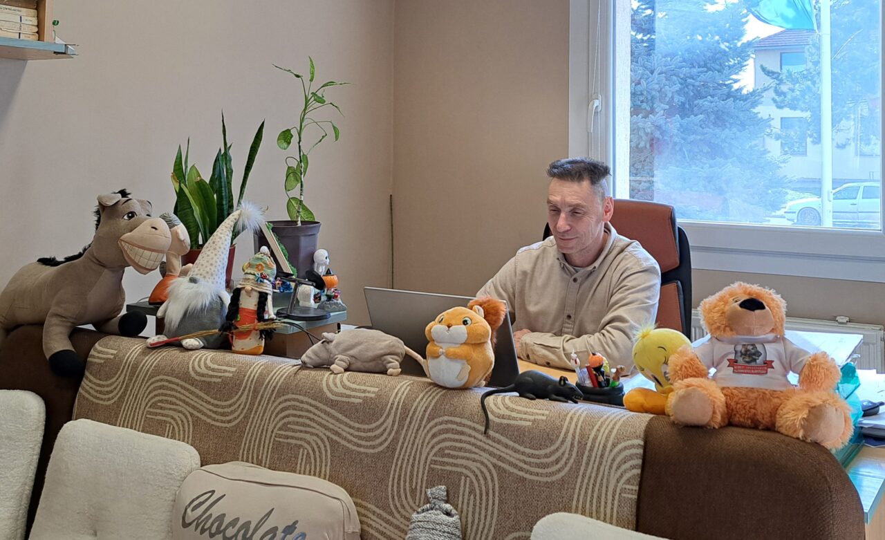 Az irodájába lépve, az íróasztala előtti kanapén sorakozó, színes plüssjátékok ragadják meg a tekintetem, élükön egy hatalmas és széles mosolyú csacsival. — Le kell kötni a gyermekek figyelmét, amíg a szülőkkel beszélgetek, ők eljátszanak – magyarázza mosolyogva, miközben hellyel kínál a barátságos környezetben. — Néhány játék sajátom, de legtöbbje adományokból került hozzánk. A gyerekek szeretik megölelgetni őket. Néha, ha nagyon megtetszik nekik valamelyik, magukkal is vihetik – folytatja Goda Attila, amikor belevágunk a beszélgetésbe.