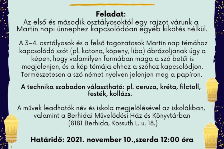 A Német Nemzetiségi Önkormányzat szervezésében gyermekrajzokból nyílik kiállítás a Berhidai Művelődési Ház és Könyvtárban. Várják a rajzokat, majd…